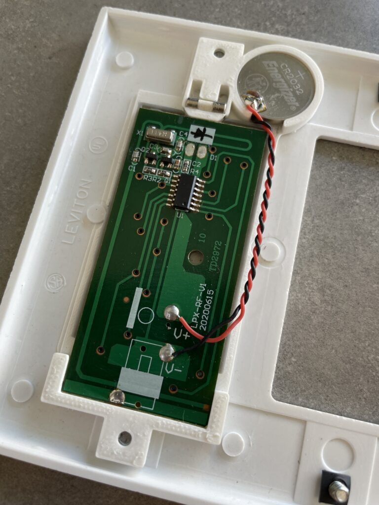 I took the remote apart and 3D print an adaptor to hold the PCB inside a custom wall plate. The coin cell is soldered… 🙂 I don’t know if you notice but there is space fuse that I design a place to clip it in 3D printed part next to the coin.